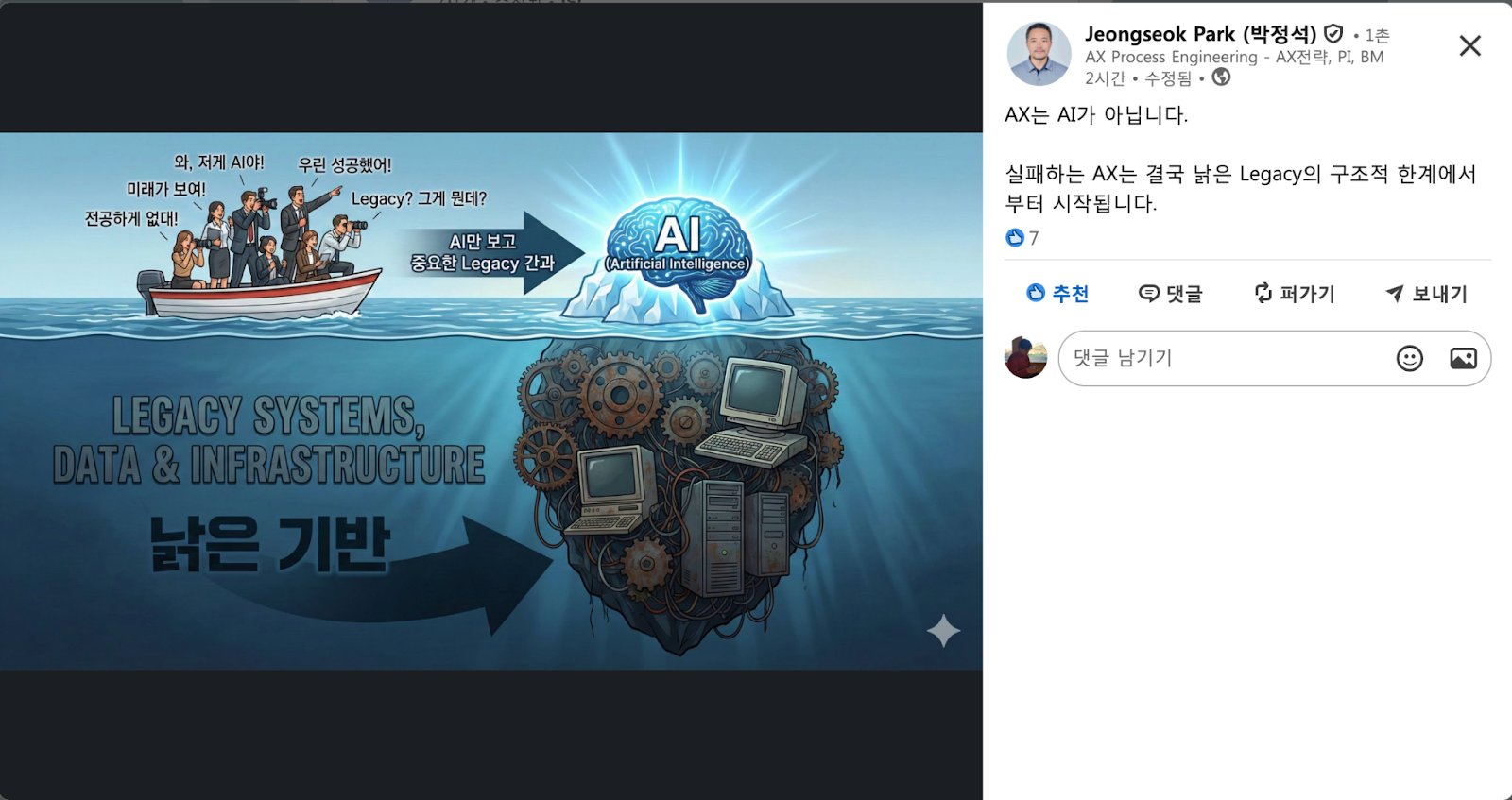 AX는 DX가 만들어낸 데이터 위에서 작동합니다. DX가 “과거와 현재의 데이터를 보여주는 것”이라면, AX는 “그 데이터를 기반으로 미래를 예측하고 스스로 판단하는 것”이지요. 이는 “천장”을 뚫고 나가는 혁신이라고 생각합니다.